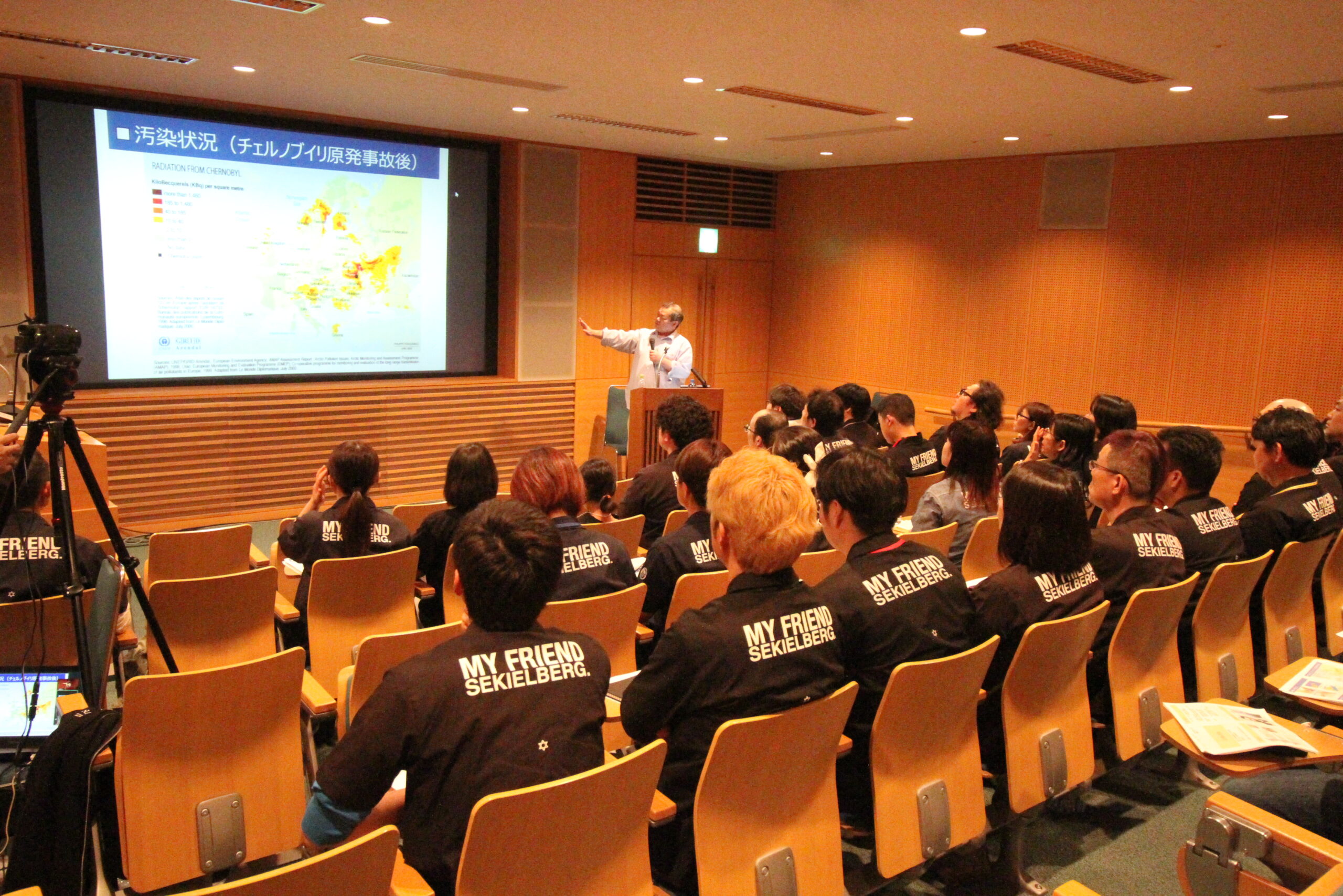 講義の前半「放射線の基礎知識」では、「放射線の発見から利用と規制」の歴史的な背景をご説明いただき、放射線の「便利さ」と「危険」の両側面を経験しながら、リスクを踏まえた上での取り扱い方に至ったことがわかりました。