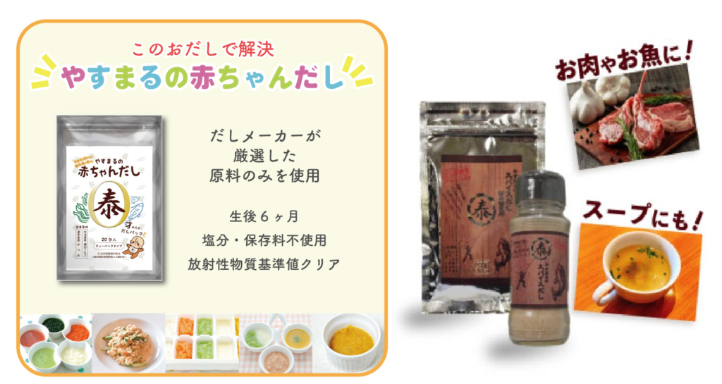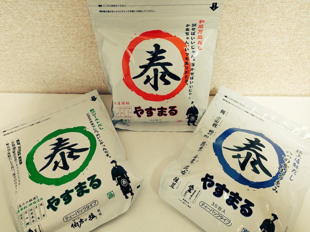 看板商品は、四国で一番売れているといわれる和風万能だし「やすまるだし」で、そのほか赤ちゃん用やキャンプ用の出汁など多くの方に手に取って頂ける商品展開をされています。